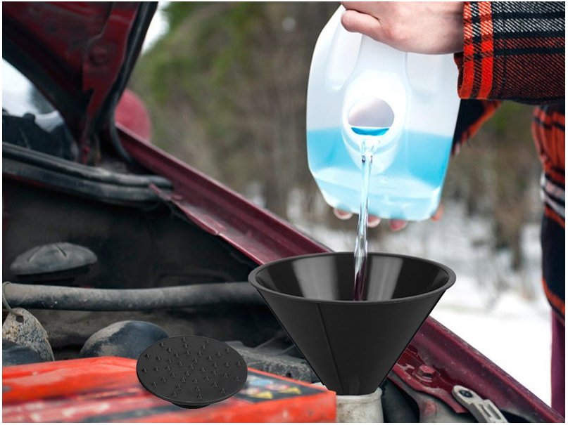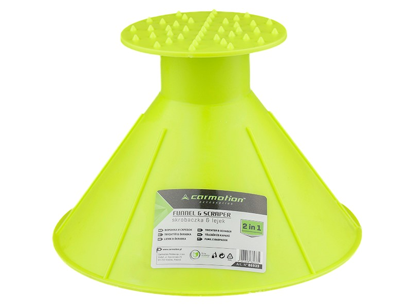 Skrobaczka i lejek do płynów eksploatacyjnych w formie jednego niewielkiego urządzenia.