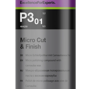Koch Chemie Micro Cut & Finish P3.01 – to najnowszej generacji pasta polerska do trwałego usuwania smug, hologramów, drobnych rys i śladów po matowaniu materiałami o gradacji P3000 z wszystkich rodzajów lakierów (w tym odpornych na zarysowania) przy jednoczesnym długotrwałym zabezpieczeniu o wysokim stopniu połysku i gładkości wykończenia.