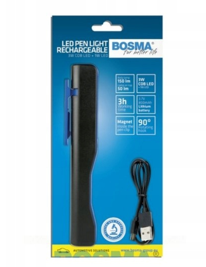 LATARKA LED BOSMA 150LM 3W COB +1W DŁUGOPISOWA ŁADOWANA USB